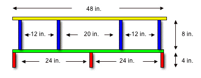 4. Now glue the 4" x 12" (red pieces) to the bottom shelf (green). I spaced them 24" apart (see diagram). Then nail them to the shelf with 1 " nails. Spacing can vary, but I chose the dimensions in the diagram to fit my equipment needs, and used only 3 of the 4 pieces. Use all 4 of you wish, depending on your needs.